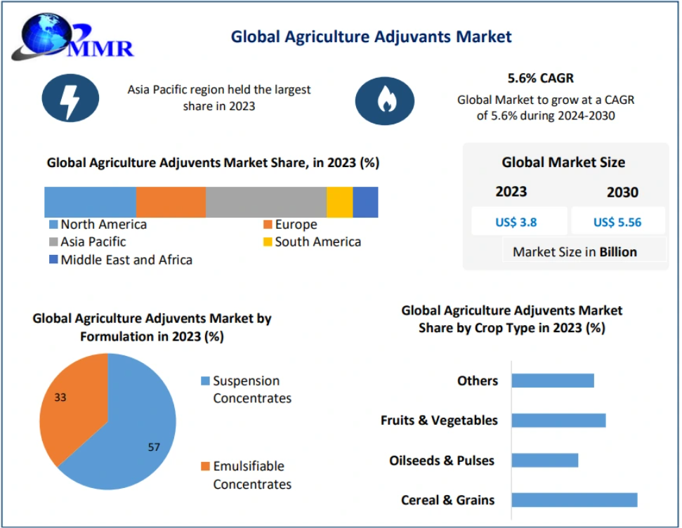 Agricultural Adjuvants Market Outlook: 2024–2030 Market Overview The global Agricultural Adjuvants Market was valued at USD 3.8 billion in 2023 and is projected to expand at a CAGR of 5.6% between 2024 and 2030, reaching approximately USD 5.56 billion by 2030. This growth is being driven by ...Read more