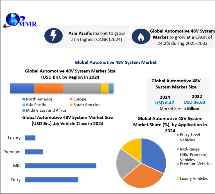Global Automotive 48V System Market Overview (2025–2032) The Global Automotive 48V System Market was valued at USD 6.47 billion in 2024 and is projected to reach USD 36.63 billion by 2032, growing at an impressive CAGR of 24.2% during the forecast period. This exponential growth reflects the ...Read more