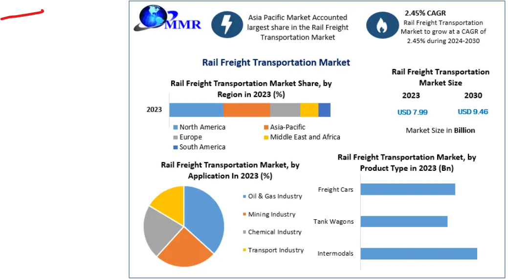 Global Rail Freight Transportation Market Overview (2024–2030) The Global Rail Freight Transportation Market was valued at USD 7.99 billion in 2023 and is projected to reach USD 9.46 billion by 2030, expanding at a CAGR of 2.45% during the forecast period. Rail freight transportation remains one of ...Read more