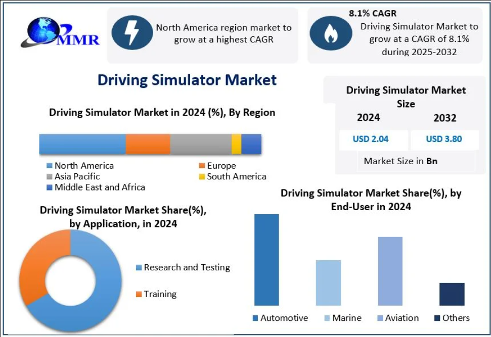 The Global Driving Simulator Market, valued at USD 2.04 billion in 2024, is projected to grow at a CAGR of 8.1% from 2025 to 2032, reaching nearly USD 3.80 billion by 2032. This upward trajectory is driven by the rapid integration of immersive simulation ...
