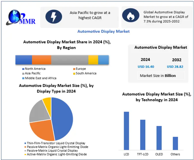 Automotive Display Market: Global Trends, Growth Drivers, and Industry Outlook The global Automotive Display Market was valued at USD 16.40 billion in 2024 and is projected to expand at a CAGR of 7.3% from 2025 to 2032, reaching approximately USD 28.82 billion by the end of the ...