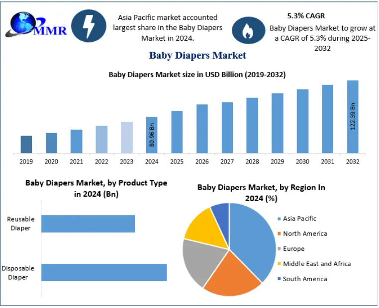 The Global Baby Diapers Market continues to expand steadily, driven by demographic changes, rising awareness of infant hygiene, and evolving consumer lifestyles. The market was valued at USD 80.96 billion in 2024 and is projected to reach USD 122.39 billion by 2032, growing at a CAGR of 5.3% from 2025 to 2032. Increasing urbanization, higher disposable incomes, and the growing participation of women in the workforce are reshaping purchasing behavior and fueling sustained demand for baby diapers worldwide.